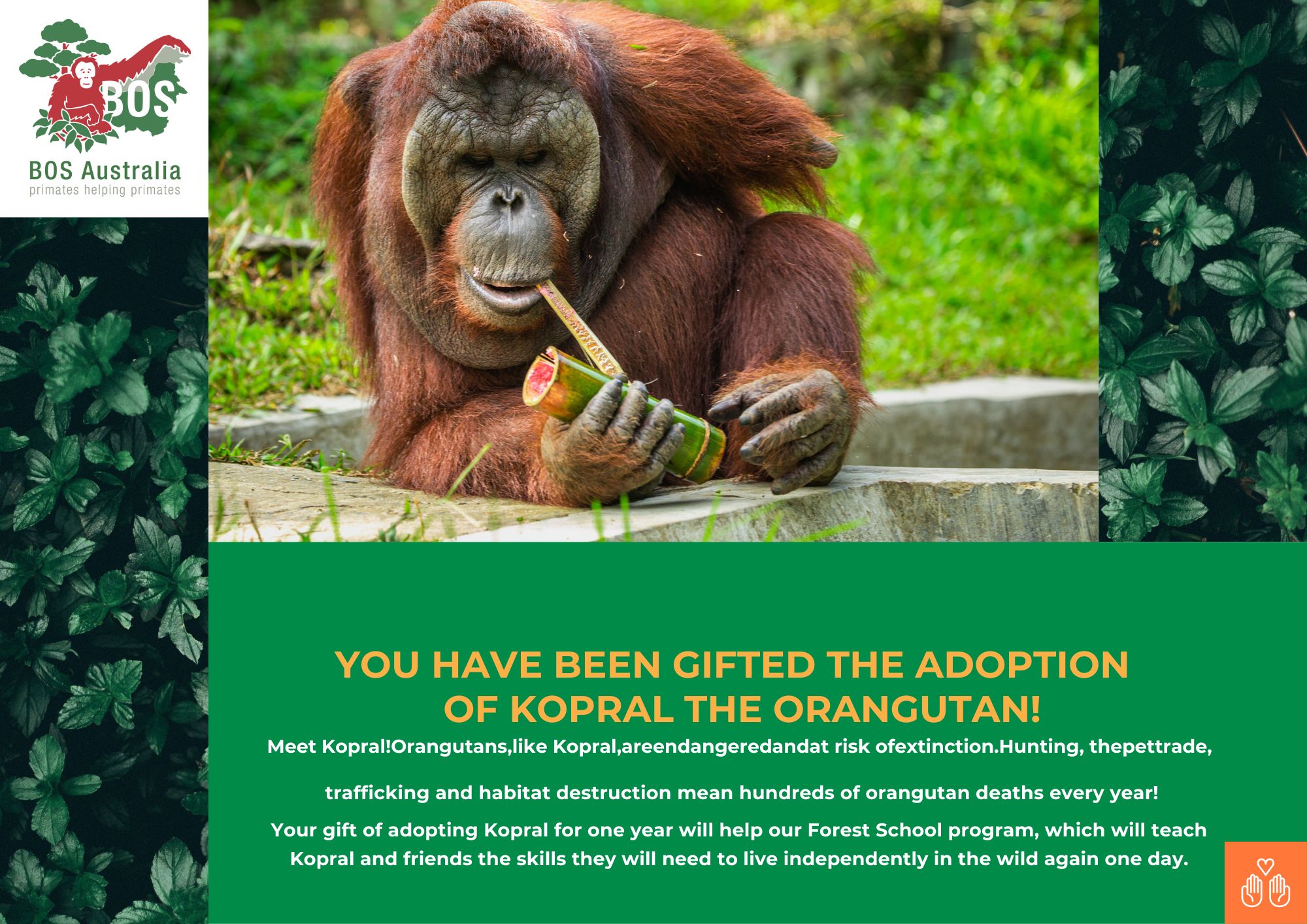 This special ‘gift’ adoption, entitles your recipient with the honour of being an adoptive orangutan parent of Kopral and his friends for 12 months. They will receive a personalised gift certificate, as well as quarterly updates about Kopral’s progress via email.