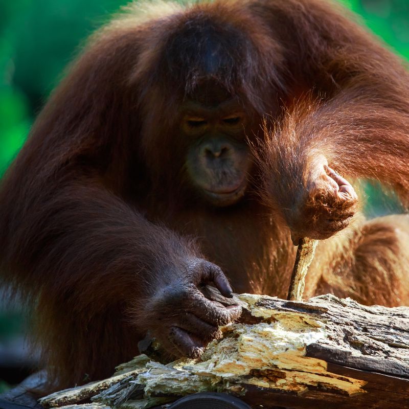 To ensure the orangutans in our care are always learning and stimulated, we provide an array of enrichment activities, both on the lawn and in their enclosures. This can include climbing frames, tyres, swings and food puzzles where they have to figure out how to get at pieces of food inside.