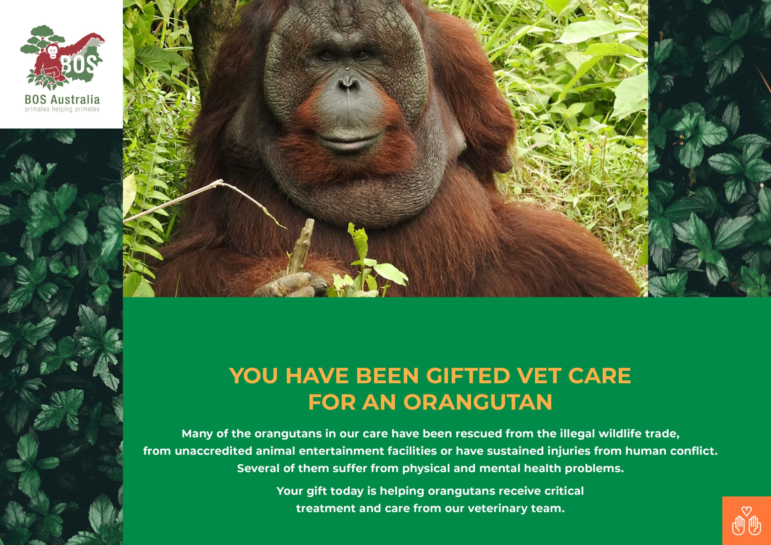 By purchasing this gift today, you can help orangutans receive critical treatment and care from our veterinary team.
