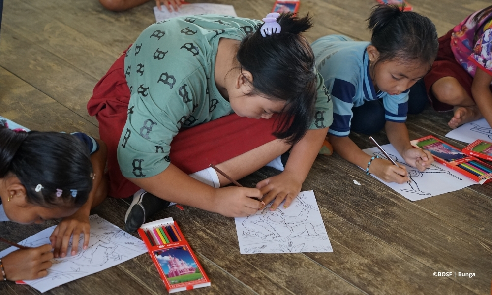 One of the main challenges of environmental education is to simplify complex conservation messages so children can easily understand them. To address this, the BOS team engaged students with fun activities, such as singing and playing games, before introducing them to their forest “neighbours”, the orangutans.